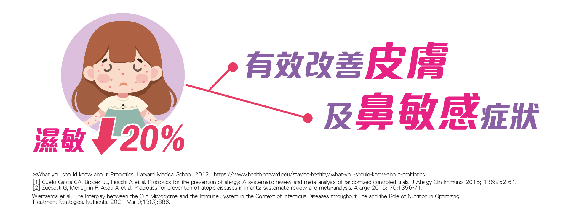 2) 母親於第三懷孕期或授母乳期間服用益生菌,亦可顯著地減少幼兒濕疹病發率。Zhang於2016年亦發表了一份接近3000個案的薈萃分析研究報告,發現若孕婦於產前及出生嬰兒服用益生菌,可幫助降低幼兒過敏症約20%。